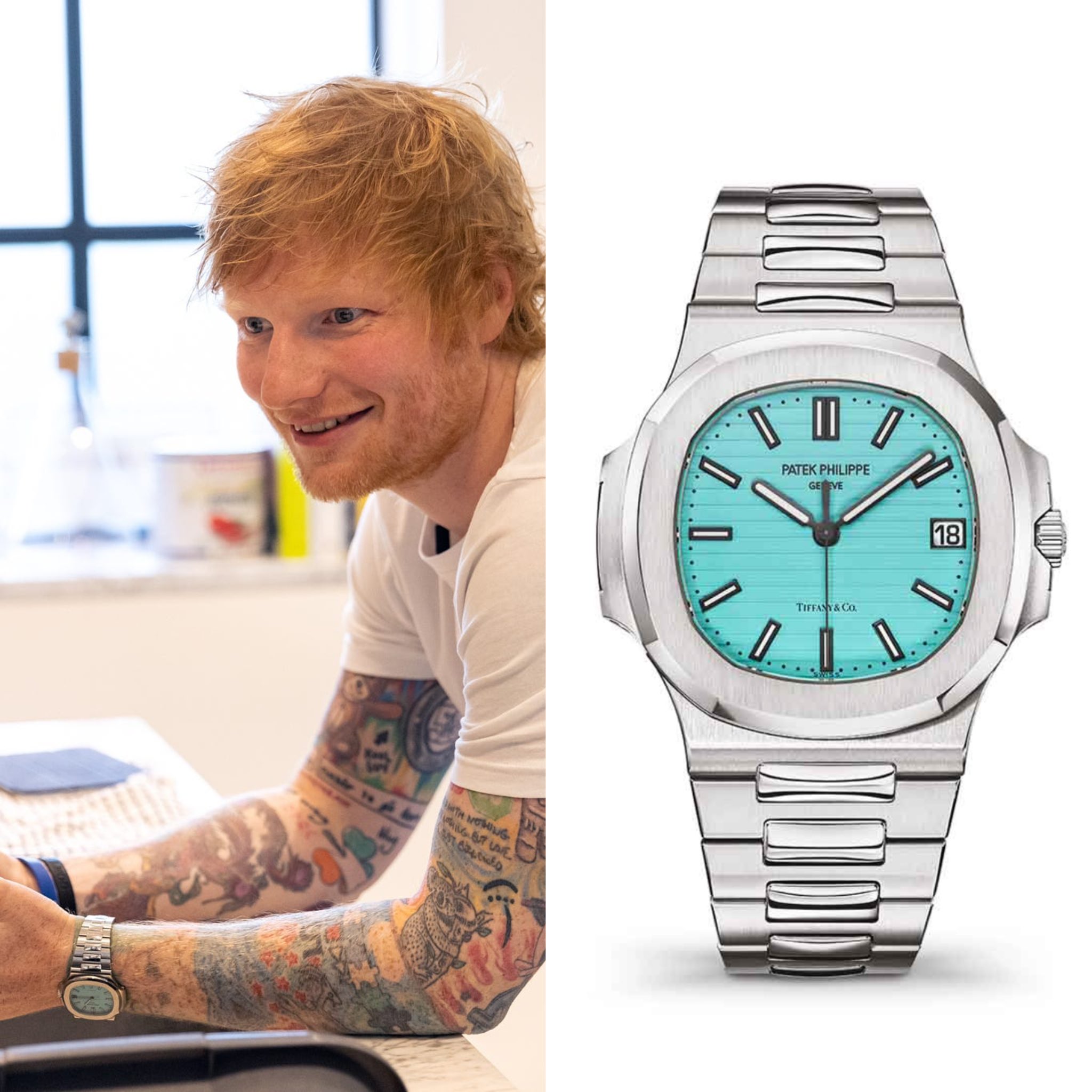 この時計は、ティファニーの象徴である「ティファニーブルー」を文字盤に使用し、6時位置には「Tiffany & Co.」のロゴ、12時位置には「Patek Philippe」のロゴが並ぶダブルネームデザインとなっています。